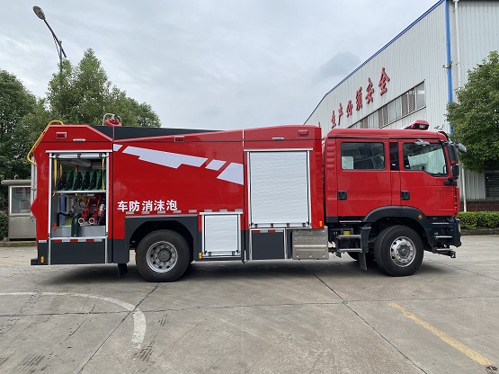 JDF5190GXFPM80/G6型泡沫消防車(chē)采用重汽汕德卡ZZ5206N471GF5底盤(pán)改裝而成。整車(chē)由消防員乘員室和車(chē)身兩大部分組成,乘員室為原裝雙排,可乘坐2+4人,該車(chē)為外露罐結(jié)構(gòu),車(chē)身前部為器材箱,中部為水罐,后部為泵房。