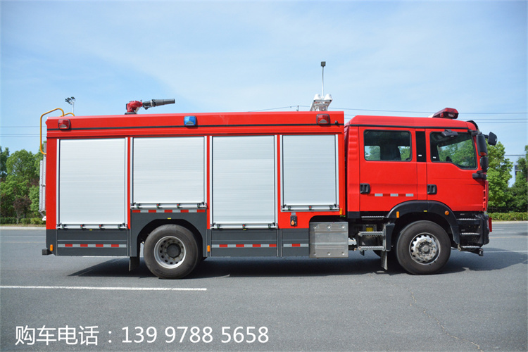 JDF5180GXFAP55/Z6壓縮空氣泡沫消防車由中國重汽汕德卡底加裝而成的;罐體總容積5.6立方,其中A類泡沫罐容積0.35立方,B類泡沫罐容只0.55立方,水罐容積4.7立方。