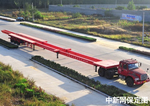 中新河北網保定10月18日電 保定曲陽縣委宣傳部18日透露,河北曲陽華運順通專用汽車制造有限公司開發的大型“風電葉片運輸車”在曲陽下線。此車的下線,成為中國風電葉片運輸車行業中的典范。