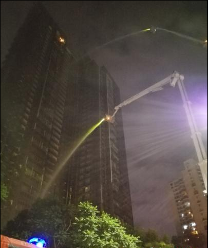 不久,現(xiàn)場消防車增至22輛、消防官兵增至110多名。兩臺消防高噴車在外圍控制了火勢蔓延。消防員攜帶救援器材,繼續(xù)徒步上樓,逐層內攻搜索排查。至21時45分,火災被完全撲滅。