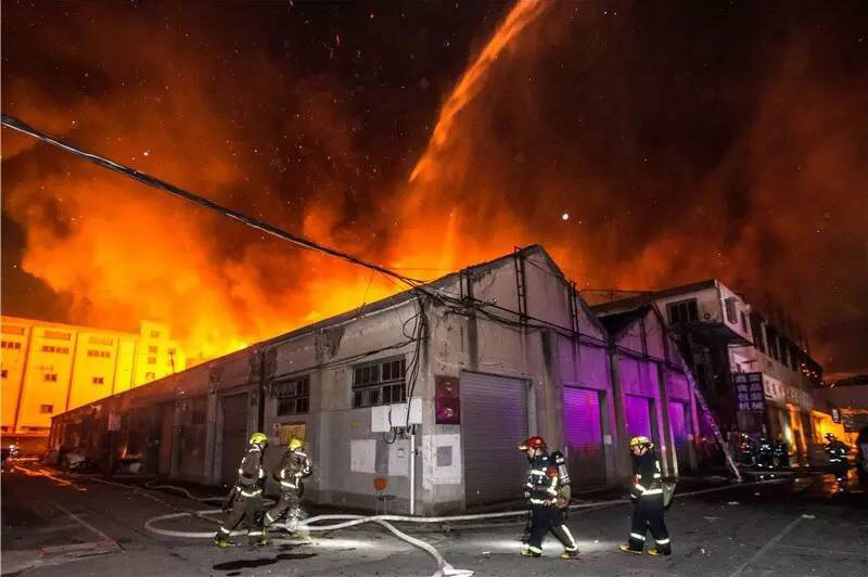 火災發生在東門大廈北面的一個城中村,火勢極大,艮山西路停了40多輛消防車,僅留一個車道供東向西車附近的艮山西路和新塘路出現大面積擁堵。圖為火勢蔓延到周邊倉庫,消防員在現場奮力撲救。