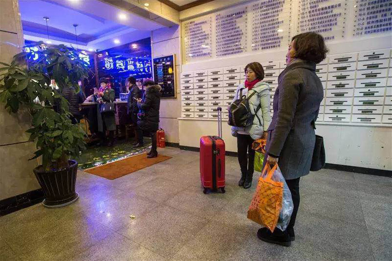 .東門大廈這邊有兩個酒店:東門賓館和布丁酒店。晚上8點多,住客都被叫起來。“賓館把我們趕下來了,說火勢太大,怕蔓延過來。”布丁酒店一個年輕女孩蹲在大門旁邊,呆呆地看著來來往往的行人。她實在無聊,便抽起了煙。圖為緊鄰火場的一家賓館,住客紛紛退房離開。