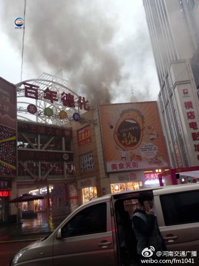 12月26日上午10點11分:鄭州二七廣場德化街內 美食廣場附近 發生火情。據現場目擊者王先生反映:火是從美食廣場3樓到4樓之間著起來的,樓上的玻璃受到著火影響幾乎全部碎裂,消防官兵分兩路,一路從二七廣場地鐵站附近趕往現場,一路從小商品城附近進入現場。而且還有帶云梯的消防車正在救援,粗略算大概有十輛車。河南交通廣播記者朱浩從現場了解到:起火的是一個飯店的后廚,截止到10點20分左右,火勢基本得到控制,但是樓上的碎玻璃不斷往下掉,請附近的車友們靠車道內側行駛。